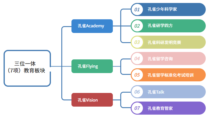 “圆梦名校只是起点”,我们更重视学生开展学习的过程,在过程中引导、在结果中印证。孔雀大讲堂,坚持Project-Based Learning(PBL)打造出:三位一体(7项)教育板块。