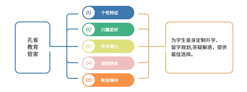 作为孔雀大讲堂的学业测评&咨询规划项目,基于大数据,依托全球顶尖教育资源,面向学生的长线人生发展、学术学业发展做整体规划,根据学生个性特征、兴趣爱好、学术潜力、理想抱负、职业倾向等,为学生量身定制升学、留学规划,答疑解惑,提供最佳选择。并提供升学、留学、高考志愿咨询等教育服务,以专业研发的志愿系统,根据学生个性特征和发展特点建立档案专业指导,支持自主评测、志愿评估,科学、精准地为学生定位,为其前途保驾护航。